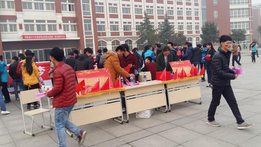 此次活动形式采用当今流行的“任务模式”。参赛人员通过抽签选择自己的队友和任务点,找到任务点后从裁判处领取“一二•九运动知识问答”题目卡。此题目卡必须由路人来回答,同学们热情高涨,积极请每位经过身边的老师或学生回答问题。最先答完题目且正确率达到90%以上者,可领取任务卡完成任务。任务主要包括:“放飞梦想、兴我中华”现场签名;召集校园行人齐唱团歌;共喊“诚信、自强、力行、拓新”校训口号;向过往师生发放“铭记历史,勿忘国耻”纪念宣传页等。同学们一声声激情飞扬的口号,吸引众多同学纷纷参加到签名活动中。在签名板上,郑重签下自己的名字,留下了他们爱国爱校的情意。