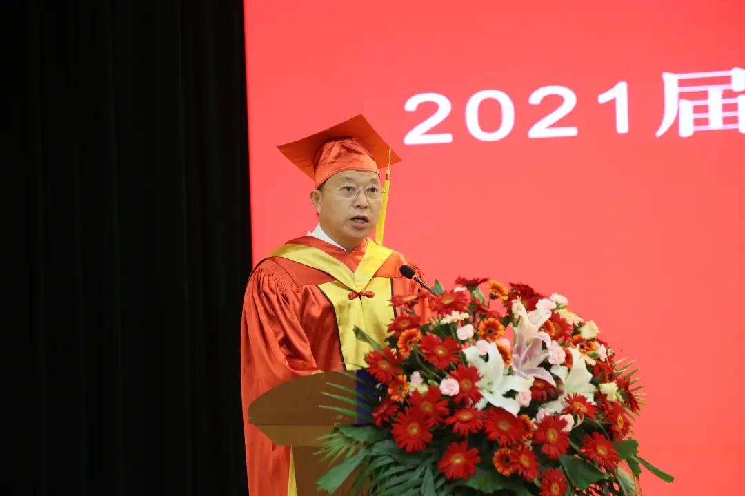 关于颁发2021届本科生毕业证书、授予本科毕业生学士学位的决定。典礼进行了隆重的颁发证书仪式,主席台就座的领导为毕业生代表拨正流苏,颁发证书。教师代表康智慧老师、毕业生代表王晨雨同学作了精彩发言。