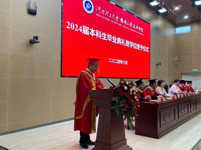 教务处处长程钢宣读授予学士学位的决定。校领导们为毕业生代表颁发毕业证书,授予学位证书。教师代表苗丽晨、毕业生代表赵志远发言。