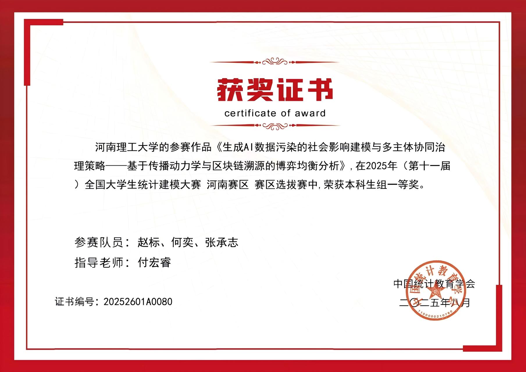 参赛队经过奋勇拼搏,荣获河南赛区一等奖1项。