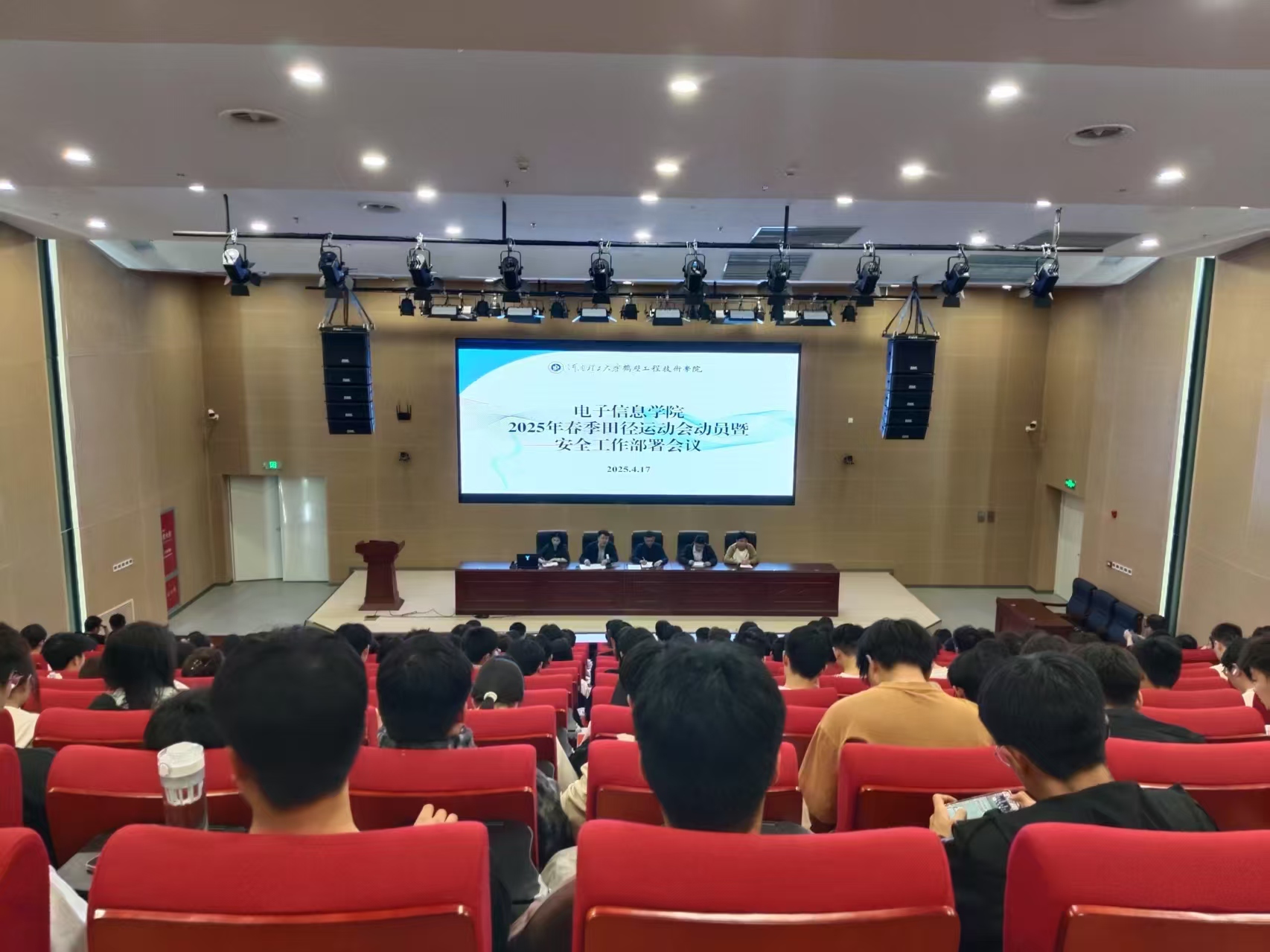 2025年春季田径运动会开幕在即,为保障赛事安全有序进行,4月17日晚,电子信息学院在3D-报告厅召开2025年春季田径运动会动员暨安全工作部署会。电子信息学院党总支副书记出席会议并讲话,学工办工作人员、专职辅导员、团总支学生会成员、运动员、专业方阵成员参加会议。