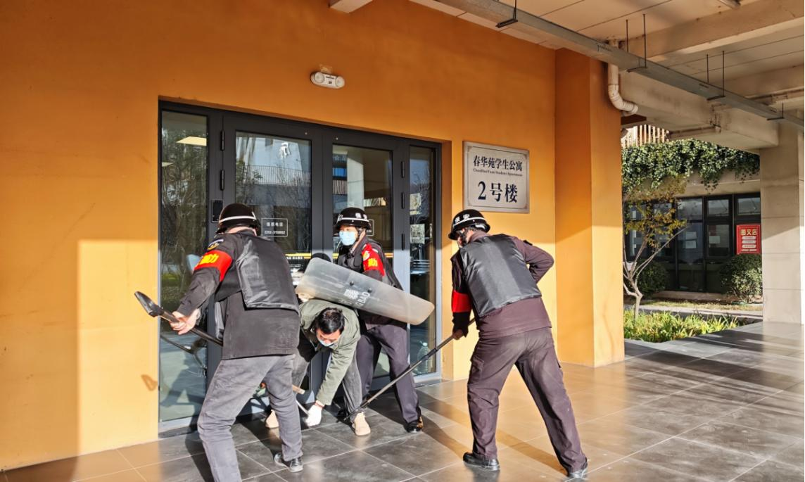 为强化校园安全防护能力,检验最小应急单元实战水平,11月27日,后勤保障部组织安保、宿管等人员在西校门及学生公寓区域开展反恐防暴演练。